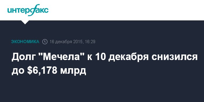 Москва. 16 декабря. INTERFAX.RU – Долг "Мечела" по состоянию на 10 декабря текущего года составляет $6,178 млрд, говорится в презентации компании.