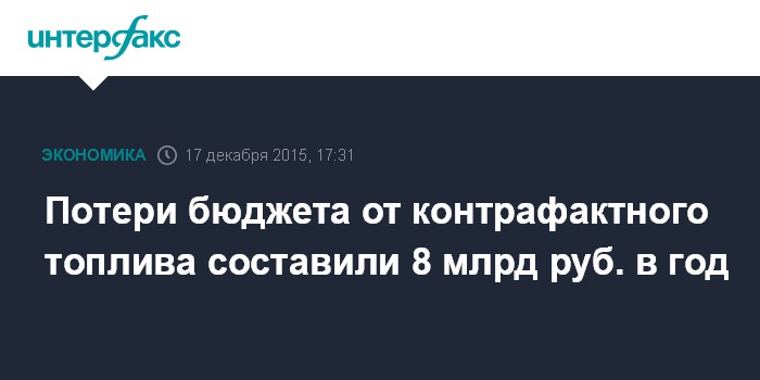 Москва. 17 декабря. INTERFAX.RU – Минэнерго оценивает потери бюджета от производства контрафактного топлива в 8 млрд рублей, сообщил "Интерфаксу" директор департамента переработки и транспортировки нефти Михаил Грязнов.