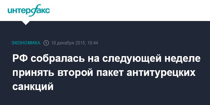 Москва. 18 декабря. INTERFAX.RU – Правительство может принять постановление, расширяющее перечень санкций против Турции, на следующей неделе, сообщил журналистам источник в Минэкономразвития.