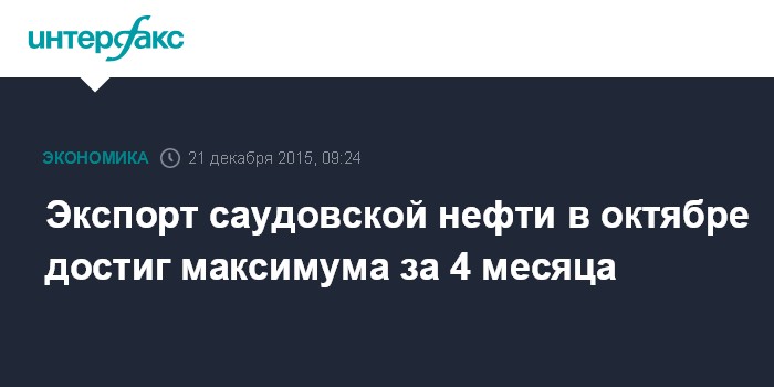 Москва. 21 декабря. INTERFAX.RU – Саудовская Аравия увеличила экспорт нефти в октябре до максимального объема за четыре месяца, свидетельствуют данные Joint Organization Data Initiative (JODI).