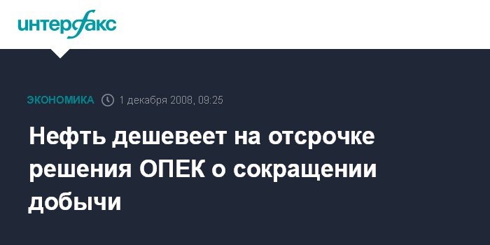 Москва. 1 декабря. INTERFAX.RU - Нефть дешевеет после того, как Организация стран-экспортеров нефти (ОПЕК) на внеочередной встрече в Каире 29 ноября отложила принятие решения о сокращении производства до своей конференции, которая пройдет 17 декабря в алжирском Оране, сообщило агентство Bloomberg.