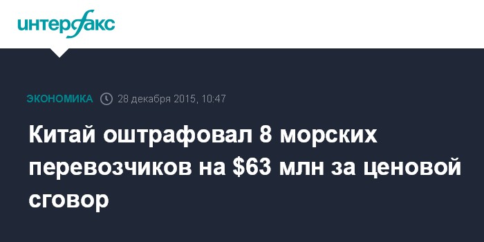Москва. 28 декабря. INTERFAX.RU – Китайский антимонопольный регулятор оштрафовал восемь компаний, занимающихся морскими перевозками, на общую сумму в 407 млн юаней ($63 млн), обвинив их в картельном сговоре с целью завышения цен на перевозку транспортных средств и тяжелого оборудования, сообщило агентство Bloomberg.