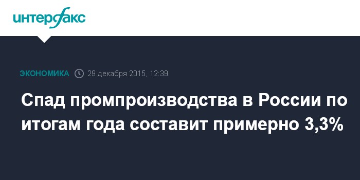 Москва. 29 декабря. INTERFAX.RU – Спад промышленного производства в России в 2015 году составит примерно 3,3%, в обработке - около 5%, заявил министр промышленности и торговли РФ Денис Мантуров.