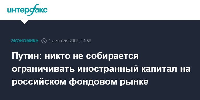"Никто не собирается ограничивать активность иностранного капитала на российском фондовом рынке, мы приветствуем иностранных инвесторов. Но наряду с этим задача состоит в том, чтобы создать по-настоящему массовый класс отечественных инвесторов, собственные мощные финансовые институты", - сказал Путин в понедельник на заседании президиума правительства РФ.