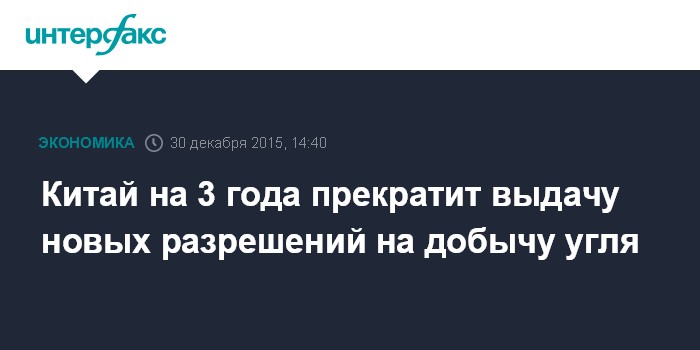 Москва. 30 декабря. INTERFAX.RU – Власти Китая в 2016-2018 годах приостановят выдачу новых разрешений на добычу угля в связи с чрезмерным загрязнением окружающей среды, сообщает агентство Bloomberg.