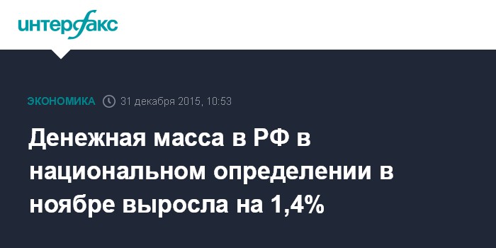 Москва. 31 декабря. INTERFAX.RU - Денежная масса (агрегат М2) в России в национальном определении в ноябре 2015 года выросла на 1,4%, до 33 трлн 315,4 млрд рублей, сообщается на сайте ЦБ РФ.