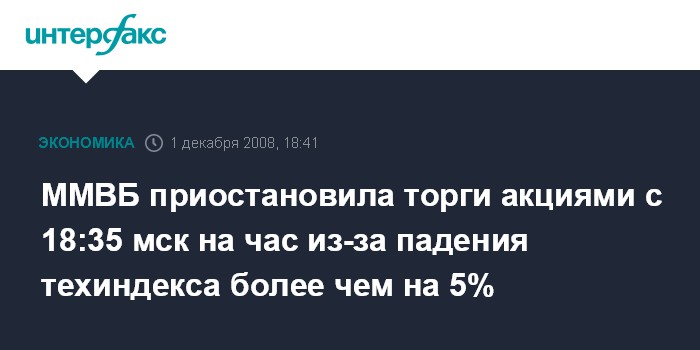 ММВБ приостановила торги акциями с 18:35 мск на час из-за падения техиндекса более чем на 5%