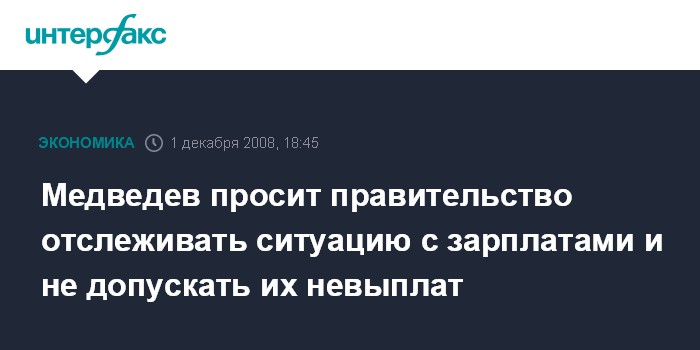 Москва. 1 декабря. INTERFAX.RU - Президент России Дмитрий Медведев поручил правительству не допускать ситуаций с невыплатой заработной платы сотрудникам как на госпредприятиях, так и в коммерческих компаниях.