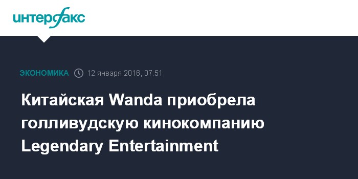 Москва. 12 января. INTERFAX.RU - Китайская девелоперская компания Dalian Wanda Group объявила во вторник о приобретении американской кинокомпании Legendary Entertainment.