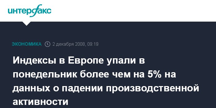 Москва. 2 декабря. INTERFAX.RU - Европейские фондовые индексы упали в понедельник на 5,1-5,9% на данных о резком снижении производственной активности по всему миру, сообщило агентство Bloomberg. Индекс Dow Jones Stoxx 600 рухнул на 6% - до 193,91 пункта, что стало максимальным падением с октября.