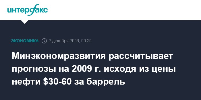 Минэкономразвития рассчитывает прогнозы на 2009 г. исходя из цены нефти $30-60 за баррель