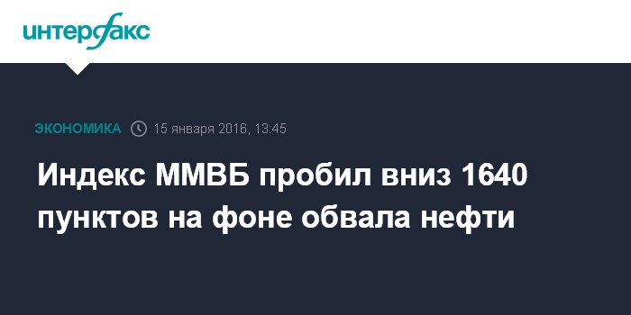 Москва. 15 января. INTERFAX.RU – Рынок акций РФ днем в пятницу ускорил падение вслед за обвалом нефти, ушедшей под отметку $30 за баррель, индекс ММВБ пробил поддержку 1650 пунктов и ушел ниже 1640 пунктов, несмотря на резкое ослабление рубля.
