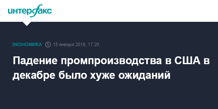 Москва. 15 января. INTERFAX.RU – Объем промпроизводства в США в декабре 2015 года сократился на 0,4%, говорится в отчете Федеральной резервной системы. Эксперты, опрошенные агентством Bloomberg, в среднем прогнозировали уменьшение показателя на 0,2%.