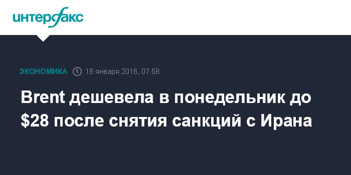 Brent дешевела в понедельник до $28 после снятия санкций с Ирана