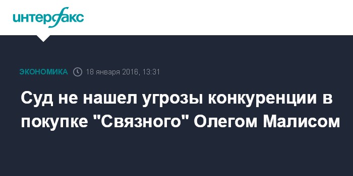 Москва. 18 января. INTERFAX.RU – Приобретение Олегом Малисом контроля над ритейлером "Связной" не повлекло за собой ограничение конкуренции на рынках продажи абонентских контрактов и смартфонов - к такому выводу пришел Московский арбитраж, рассмотрев иск МТС и ее розничной "дочки" "Русская телефонная компания" (РТК) к ФАС.