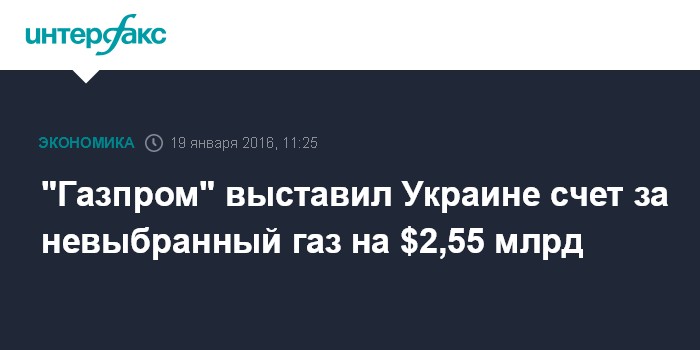Москва. 19 января. INTERFAX.RU – "Газпром" во вторник направил "Нафтогазу Украины" счет на оплату газа, невыбранного украинской компанией в третьем квартале 2015 года по условию "бери-или-плати". Размер претензий составил $2,55 млрд.