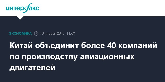 Москва. 19 января. INTERFAX.RU – Китай планирует объединить свыше 40 компаний, связанных с производством авиационных двигателей, в рамках группы с активами на 145 млрд юаней ($22 млрд), чтобы повысить роль сложных производств в экономике, сообщает агентство Bloomberg со ссылкой на информированные источники.
