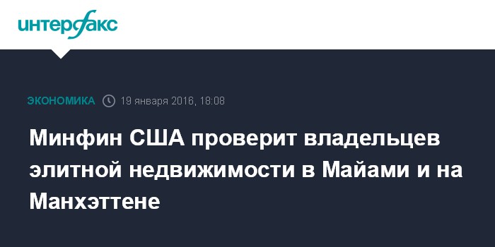 Москва. 19 января. INTERFAX.RU - Министерство финансов США обнародовало план выявления истинных владельцев элитной недвижимости, приобретенной за наличные на Манхэттене и в округе Майами-Дейд на юге Флориды.