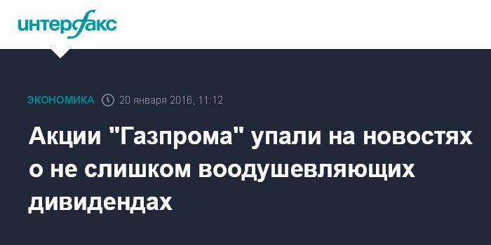 Москва. 20 января. INTERFAX.RU – Акции "Газпрома" утром в среду снижаются вместе со всем рынком, новости о размере планируемых дивидендов за 2015 год не воодушевили покупателей, поскольку размер выплат остался на уровне 2014 года.