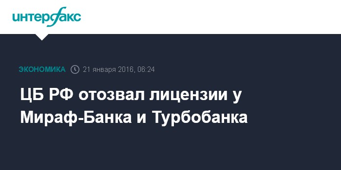 Москва. 21 января. INTERFAX.RU - Центробанк отозвал лицензии на осуществление банковских операций у АО "Мираф-Банк" и у зарегистрированного в Петербурге Турбобанка, сообщает пресс-служба регулятора.