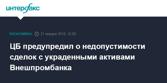 ЦБ предупредил о недопустимости сделок с украденными активами Внешпромбанка