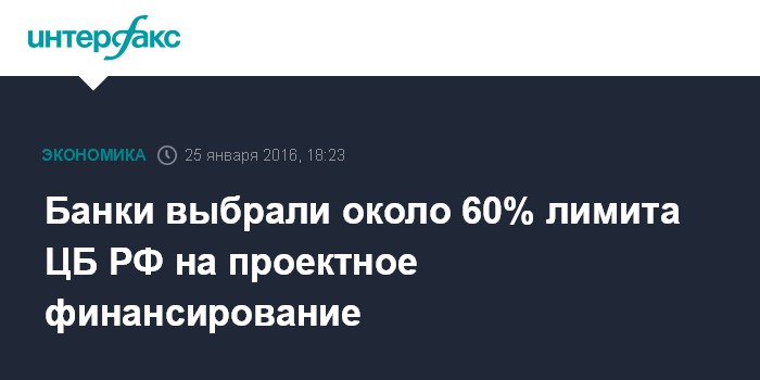 Москва. 25 января. INTERFAX.RU - Банки - участники программы проектного финансирования выбрали около 60% лимита ЦБ РФ в рамках этого механизма.