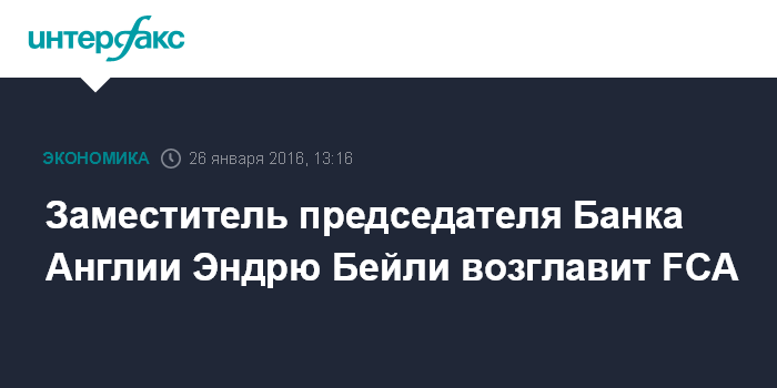 Москва. 26 января. INTERFAX.RU – Заместитель председателя Банка Англии Эндрю Бейли станет новым главой британского Управления по контролю за соблюдением норм поведения на финансовых рынках (Financial Conduct Authority, FCA), сообщает агентство Bloomberg со ссылкой на заявление министра финансов страны Джорджа Осборна.