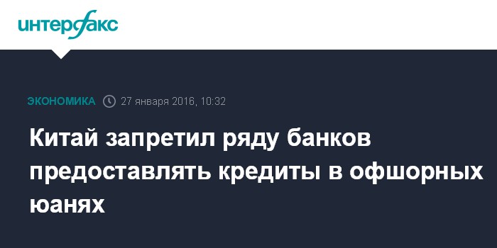 Москва. 27 января. INTERFAX.RU – Народный банк Китая дал указание ряду китайских банков в Гонконге приостановить кредитование в офшорных юанях без крайней необходимости для того, чтобы сдержать короткие продажи и сократить ликвидность, сообщили агентству Bloomberg источники, знакомые с ситуацией.