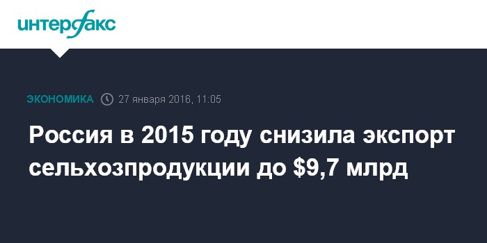 Москва. 27 января. INTERFAX.RU – Россия в 2015 году снизила экспорт сельхозпродукции до $9,7 млрд против $11,7 млрд в 2014 году, сообщил руководитель департамента растениеводства Минсельхоза Петр Чекмарев на Всероссийском агрономическом совещании в среду в Москве.