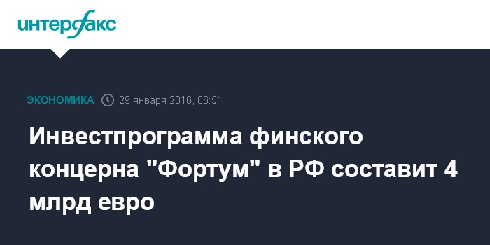 Москва. 29 января. INTERFAX.RU - Общая стоимость инвестпрограммы финского энергетического концерна "Фортум" в России по созданию новых энергогенерирующих мощностей составит четыре млрд евро.