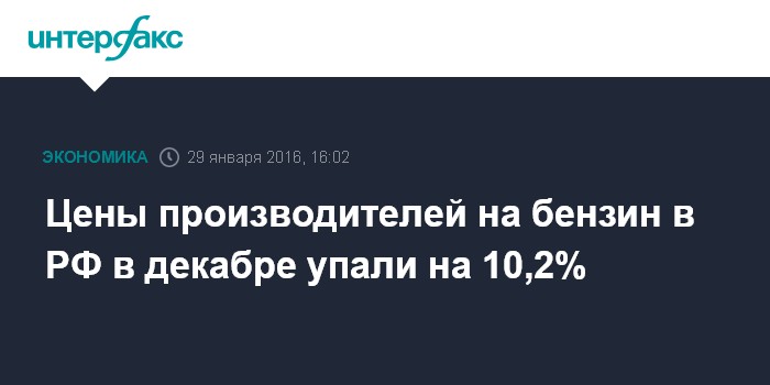 Москва. 29 января. INTERFAX.RU – Цены производителей на бензин в России в декабре упали на 10,2% после снижения на 7,5% в ноябре, на 4,2% в октябре, на 1,6% в сентябре, роста на 2,6% в августе, скачка на 9% в июле, на 10,5% в июне, повышения на 1% в мае, на 0,8% в апреле, на 8,2% в марте, снижения на 0,1% в феврале и роста на 0,3% в январе, сообщил в пятницу Росстат.