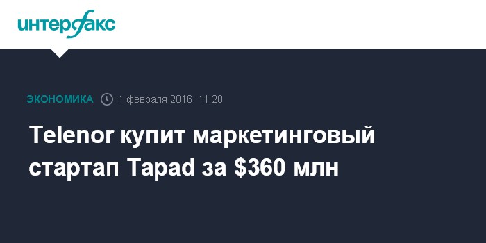 Москва. 1 февраля. INTERFAX.RU – Норвежский телекоммуникационный холдинг Telenor намерен приобрести около 95% акций американского стартапа Tapad Inc. за $360 млн.