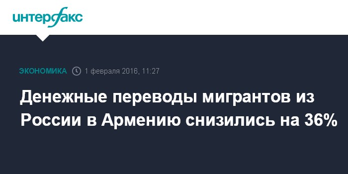 Москва. 1 февраля. INTERFAX.RU – Денежные переводы, поступившие в 2015 году в Армению от мигрантов из России, составили $916 млн, сократившись по сравнению с 2014 годом на 36,1%, говорится в сообщении Центробанка республики.