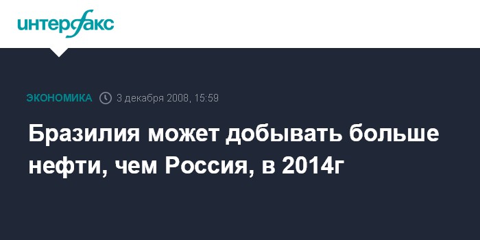 Москва. 3 декабря. INTERFAX.RU - Добыча нефти в Бразилии может превысить объемы российского производства в 2014 г., пишет Gazeta Mercantil со ссылкой на заявление консультанта бразильской нефтяной госкомпании Petroleo Brasileiro SA Хосе Карлоса Видала.