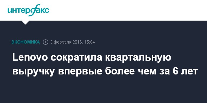 Москва. 3 февраля. INTERFAX.RU – Китайская Lenovo Group, крупнейший в мире производитель персональных компьютеров по объему поставок, сократила квартальную выручку впервые более чем за шесть лет из-за ослабления спроса на ПК и мобильные телефоны.