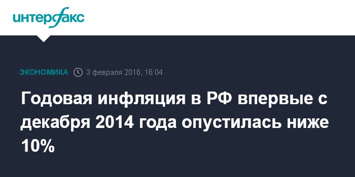 Это означает, что в годовом выражении инфляция снизилась до однозначных значений, впервые с середины декабря 2014 года и могла составить к началу февраля 9,6-9,7%.