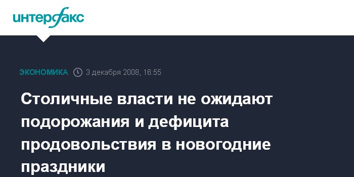 Москва. 3 декабря. INTERFAX.RU - Запасы продовольствия, которыми располагает правительство города, позволяют с уверенностью говорить о том, что в новогодние праздники не будет ни дефицита продуктов, ни роста цен на питание, заявил первый заместитель руководителя департамента продовольственных ресурсов Москвы Виктор Ольховой на пресс-конференции в среду.