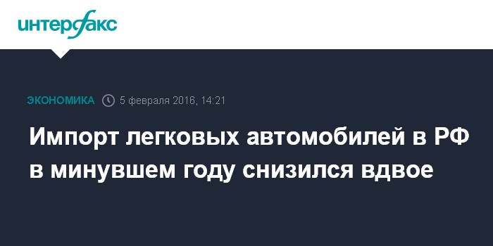 Москва. 5 февраля. INTERFAX.RU – Импорт легковых автомобилей в РФ в 2015 году составил 349,9 тыс. единиц на общую сумму $6,49 млрд., что более чем на 50% ниже показателя прошлого года (703,3 тыс.), говорится в сообщении Федеральной таможенной службы .