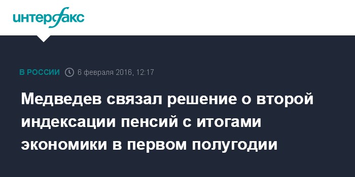 Москва. 6 февраля. INTERFAX.RU - Премьер России Дмитрий Медведев заявил, что решение о второй индексации пенсий в 2016 году будет принято по итогам экономического развития страны в первом полугодии.