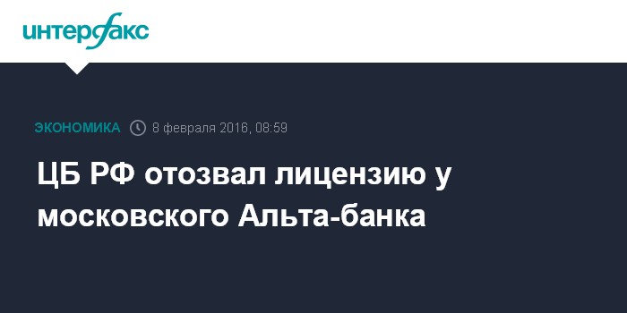 ЦБ РФ отозвал лицензию у московского Альта-банка