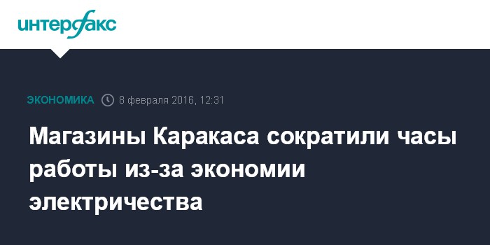 Москва. 8 февраля. INTERFAX.RU – Торговые центры в Каракасе приняли решение о переходе на сокращенный график работы: они будут открыты всего по четыре часа в день. Магазины вынуждены были пойти на такой шаг для того, чтобы соответствовать постановлению правительства Венесуэлы об экономии электроэнергии, сообщает BBC.