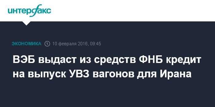 Москва. 10 февраля. INTERFAX.RU - Внешэкономбанк (ВЭБ) планирует предоставить "Уралвагонзаводу" (УВЗ) 11,2 млрд руб. на производство и поставку в Иран 5 тыс. грузовых вагонов, использовав для этого средства Фонда национального благосостояния (ФНБ).
