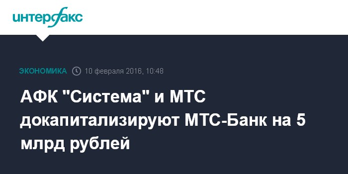 Москва. 10 февраля. INTERFAX.RU – АФК "Система" и ее "дочка" МТС выкупают дополнительные акции МТС-Банка на общую сумму 5 млрд рублей.