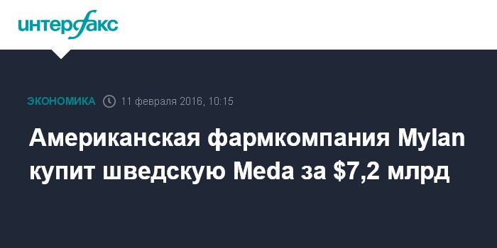Москва. 11 февраля. INTERFAX.RU – Американская фармацевтическая компания Mylan NV договорилась о приобретении шведского конкурента Meda AB за $7,2 млрд денежными средствами и акциями, сообщается в пресс-релизе. Mylan уже пыталась купить Meda в 2014 году, однако безуспешно, отмечает MarketWatch.