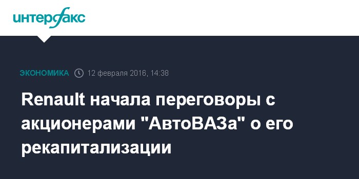 Москва. 12 февраля. INTERFAX.RU – Французский автомобилестроительный концерн Renault начал переговоры с партнерами по компании Alliance Rostec Auto BV (СП ГК "Ростех" и альянса Renault-Nissan, владеет акциями "АвтоВАЗа") с целью рекапитализации компании, говорится в отчетности Renault.