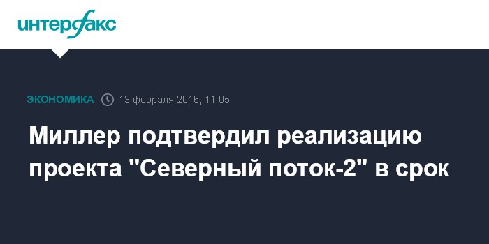 Москва. 13 февраля. INTERFAX.RU - Глава ОАО " Газпром" Алексей Миллер подтвердил, что проект "Северный поток-2" будет реализован в срок - до 2019 года, хотя сроки тендеров затягиваются.