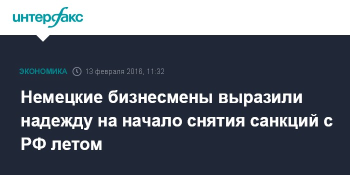 Москва. 13 февраля. INTERFAX.RU - Германский бизнес рассчитывает, что антироссийские санкции и ответные меры начнут постепенно отменяться летом 2016 года, а встреча в Мюнхене с российским премьером будет этому способствовать.