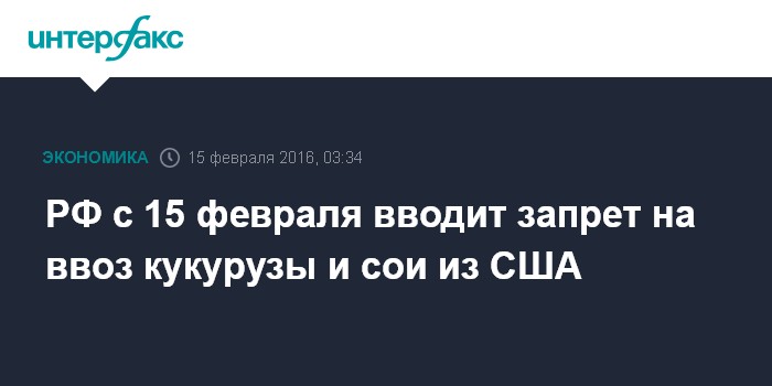 Москва. 15 февраля. INTERFAX.RU - Россия 15 февраля вводит запрет на ввоз кукурузы и сои из США из-за невыполнения российских фитосанитарных требований.