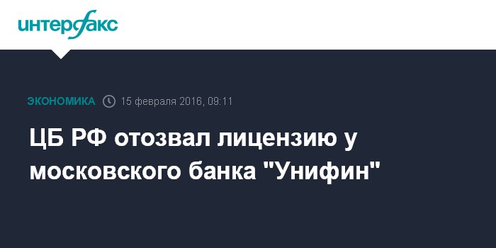 ЦБ РФ отозвал лицензию у московского банка "Унифин"