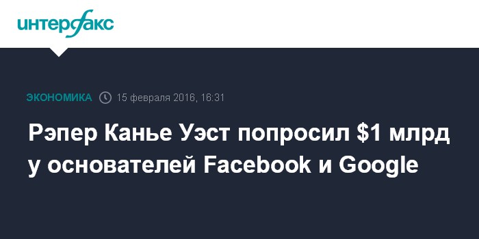 Москва. 15 февраля. INTERFAX.RU – Американский рэпер Канье Уэст призвал основателей и руководителей крупнейших высокотехнологичных компаний, включая Марка Цукерберга (Facebook) и Ларри Пейджа (Alphabet, материнский холдинг Google) вложить $1 млрд в его музыкальные проекты, пишет MarketWatch.
